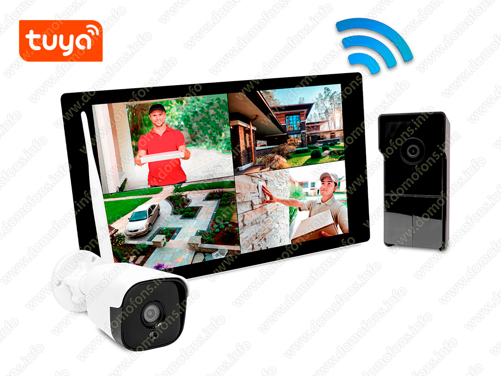 Комплект радиоканальный Wi-Fi TUYA видеодомофон с уличной камерой наблюдения "SkyNet 1000 (1+1)" Wi-Fi HD экран на 10 дюймов, 3MP вызывная видеопанель с ИК подсветкой и уличная беспроводная видеокамера 3MP