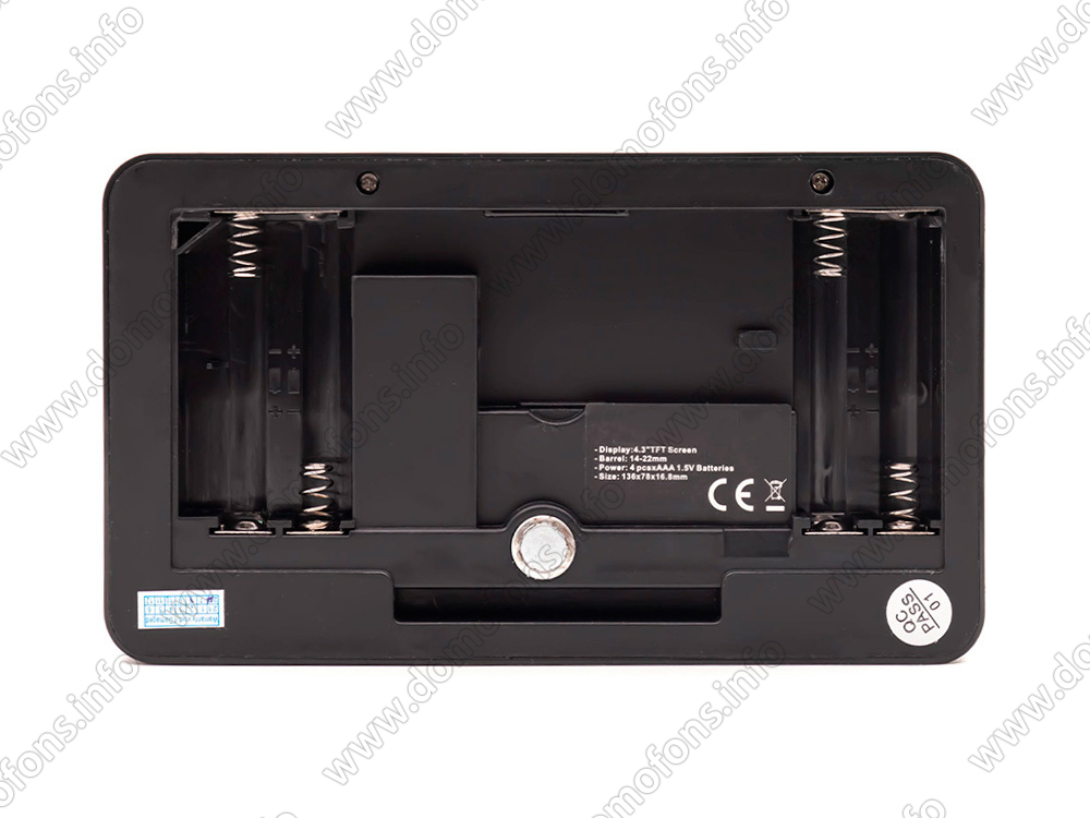 Особенностью устройства является широкий угол обзора 160°, что обеспечит полный обзор пространства перед дверью и не даст злоумышленнику возможности спрятаться. Монтаж видеоглазка предельно прост и не требует использования специнструмента. Питание устройства осуществляется от 4 батарей распространенного типоразмера «ААА».